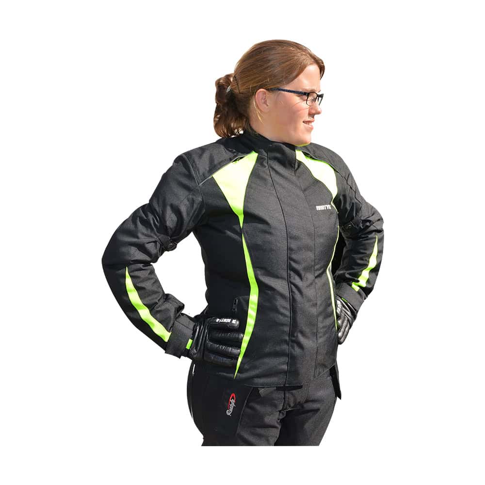 - De motorjas heeft aan de zijkanten accordeon stretch panelen voor extra flexibiliteit.