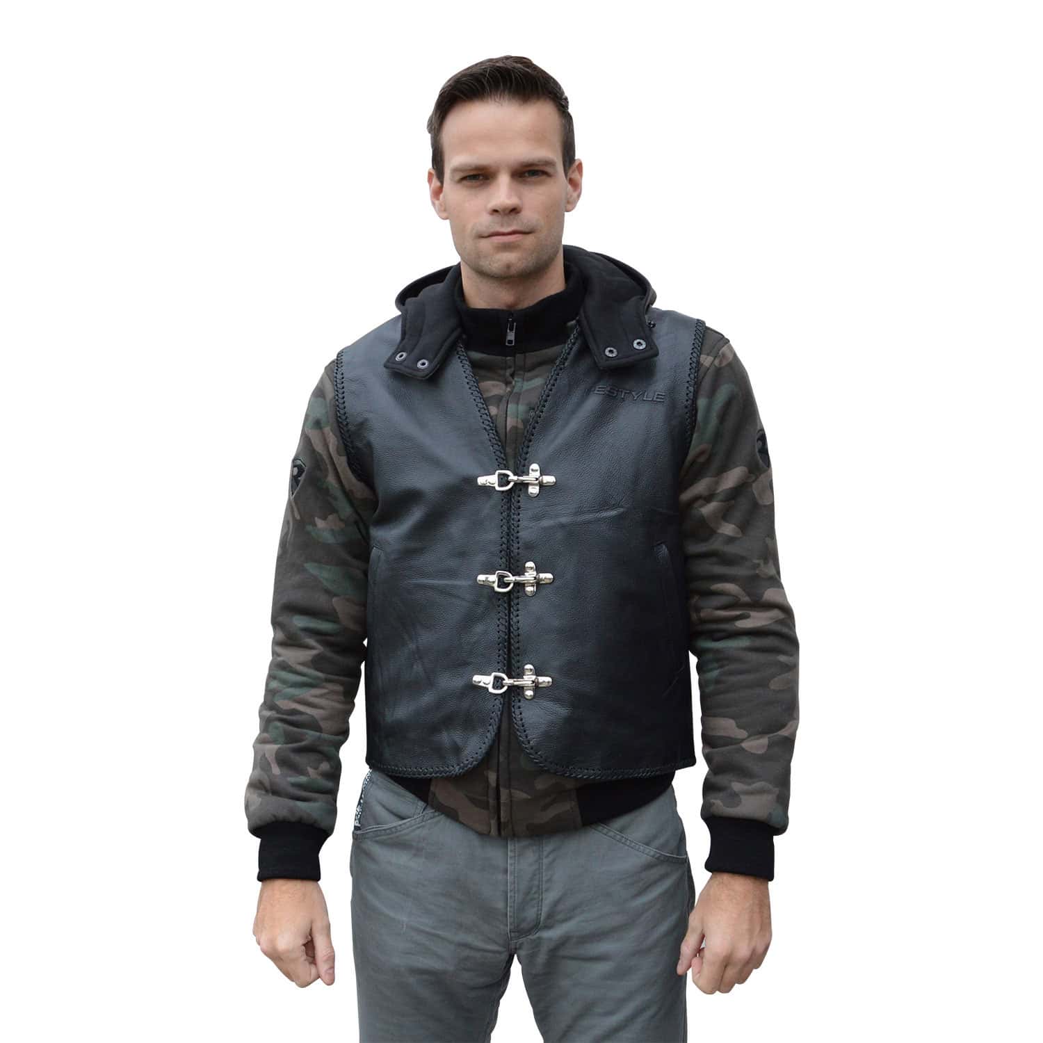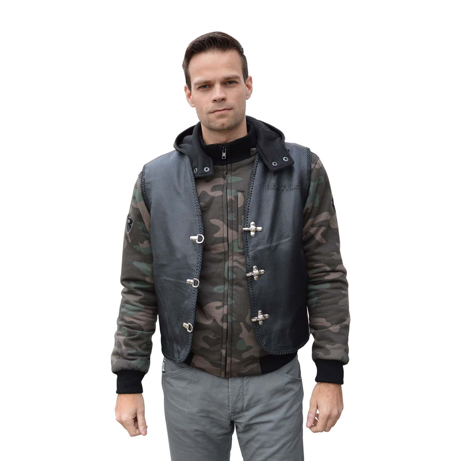 Deze RESTYLE vest is van goede en mooie kwaliteit volnerf rundleer gemaakt. Hij is voorzien van chromen haaksluiting aan de voorzijde, zodat u het vest met en zonder jas kan dragen.