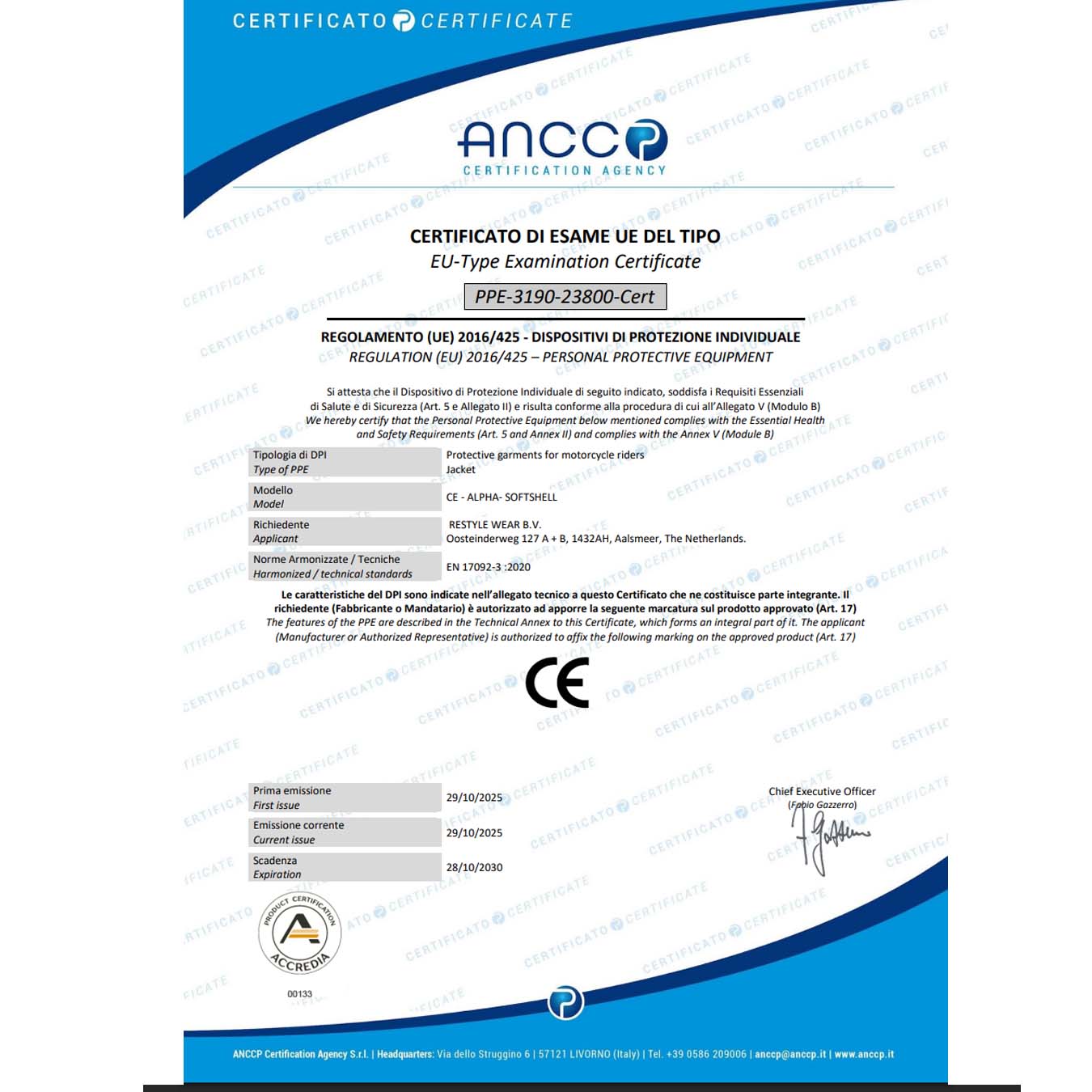 De CE-Alpha motorjas heeft een nieuwe, strenge dubbele AA-KEURING. De jas is gecertificeerd volgens EN 17092-3:2020, wat betekent dat hij voldoet aan de hoogste veiligheidseisen. Alle laboratoriumtests zijn succesvol afgerond, waardoor optimale bescherming gegarandeerd is. Het certificaat en uitgebreide keuringsrapport zijn beschikbaar via het balkje “KEURING”.