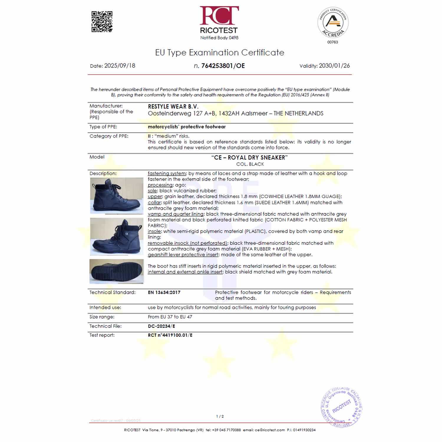 De EMC-CE ROYAL DRY SNEAKER is een Urban stijl CE-gekeurde extreem veilige en stoere motorschoen. Wij hebben deze sneakers laten keuren en er hangt een certificaat ervan in beide vestigingen met alle details. Hieronder tref je een kopie met alle informatie! Dit wil voornamelijk zeggen dat de sneakers op alle punten zijn onderzocht en je hebt dus gegarandeerd de beste kwaliteit!! Deze sneakers bieden steun dankzij een anatomisch gevormd voetbed en thermo gevormde hiel en neus. Hij ziet eruit als een comfortabele stoere hippe sneaker en dat is hij ook. Tegelijkertijd is hij een hoogwaardige, beschermende motorschoen die zorgt voor optimaal rijcomfort in alle omstandigheden. De zool heeft meerdere functies: hij biedt hele goede grip voor maximale controle, stabiliteit als je staat en flexibiliteit als je loopt. Het Hipora membraan® voering houdt je voet zelfs in de zwaarste regenbui droog en thermo gevormde protectie zorgt voor een juiste positie van je voet en voorkomt dat je voet onnatuurlijk draait of buigt. Deze motorschoenen zijn nieuw in het assortiment. Deze sneakers zijn gemaakt van het volnerf rundleer. Ze hebben anti-slip zolen, anatomisch gevormde enkelprotectie en versterkingen bij de hiel en tenen. Dankzij het anatomisch gevormde voetbed rijd en loop je lekker comfortabel, in stijl en ben je vooral goed beschermt. Als laatste is het belangrijk om te weten dat dankzij een leren flap met klittenband de veters stevig vast blijven zitten. De motorschoenen zijn in casual sfeer ook erg prettig te dragen onder een Kevlar motor spijkerbroek. Maten zijn ruim voorradig van 39 – 48! Wij hebben ook diverse modellen motor spijkerbroeken die u hierbij kunt combineren.