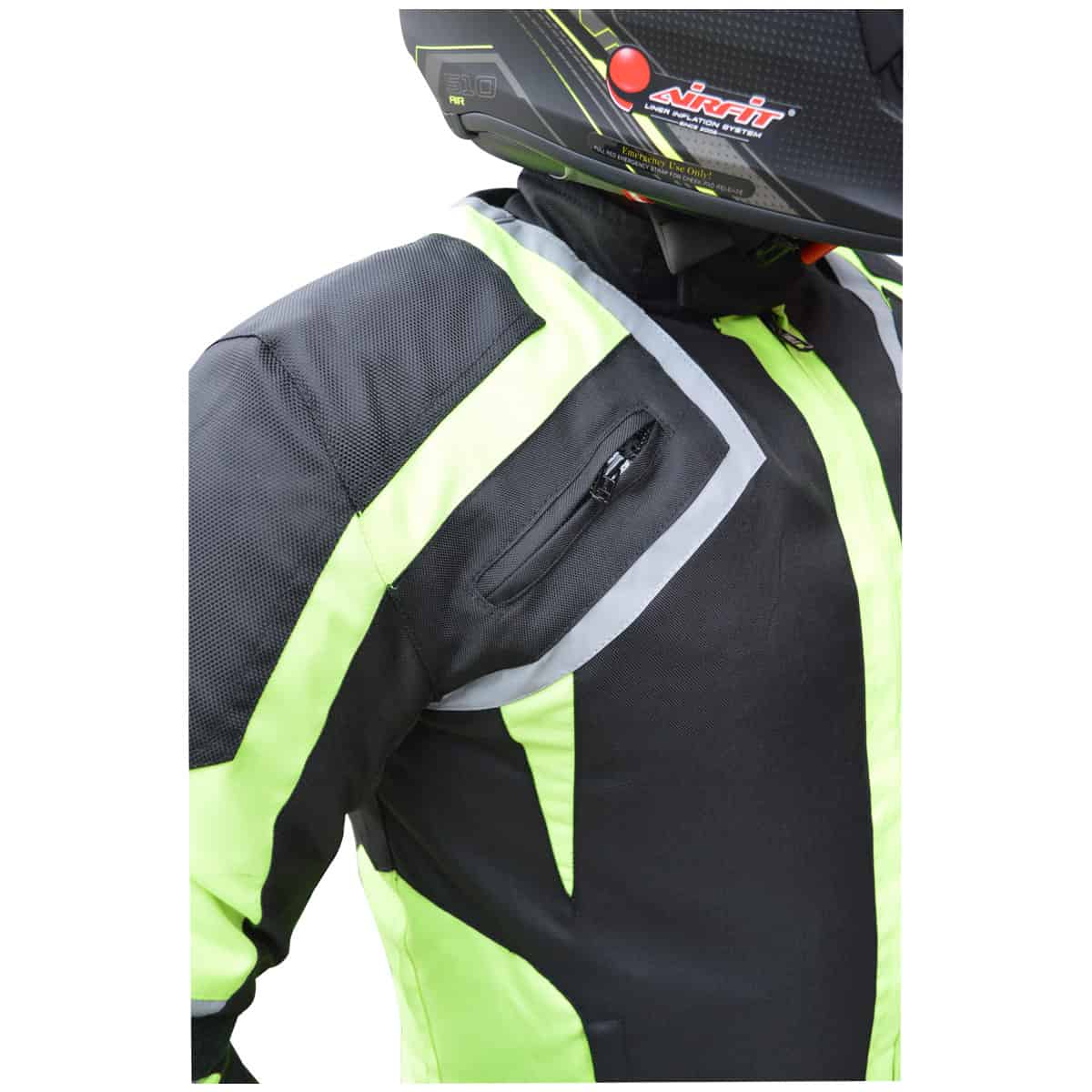 - De verstelbandjes op de armen voorkomen dat de jas gaat klapperen bij hogere snelheden en daarnaast houden ze de protectie op de juiste plek.