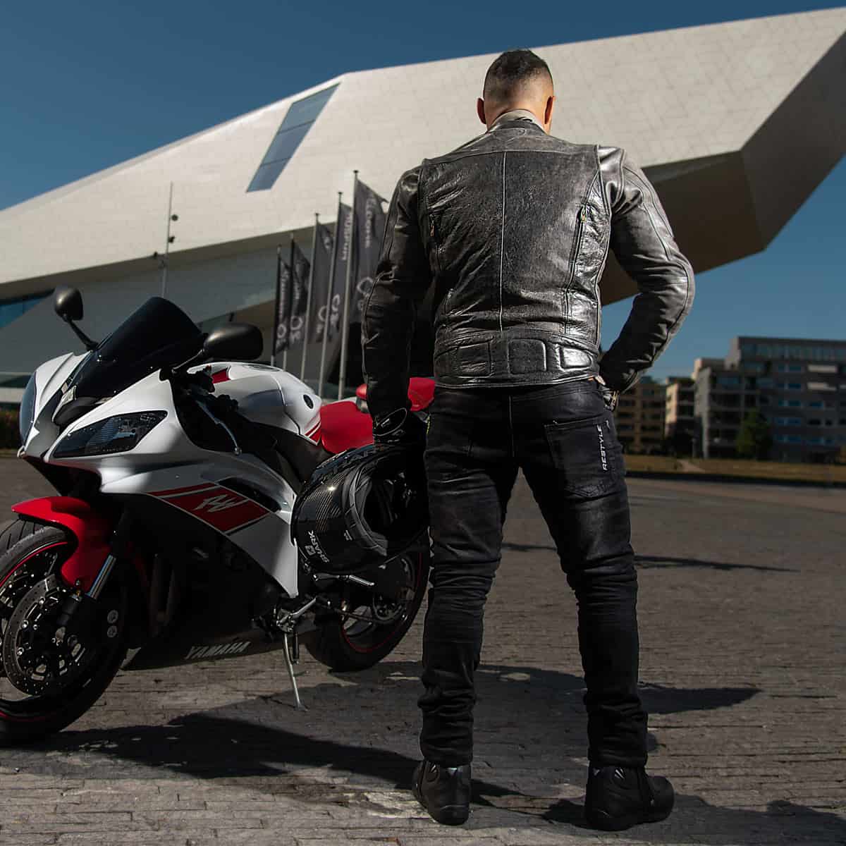 De Jacky motorjas is een klassiek uitgesneden jas, gemaakt van hoogwaardige topkwaliteit volnerf rundleder. Het uiterlijk van Jacky mag er dan klassiek uitzien, hij bevat echter wel alle hedendaagse technologieën.Hij is extreem soepel en dat voel je gelijk als je de jas aantrekt. Het jack belicht het concept van een stoere klassieke jas en hij is gemaakt van een handmatig geselecteerd, fraai behandeld leer. Hierdoor ontstaat een exclusief retro product dat als noviteit geldt binnen de motorwereld. Het uitzonderlijk zachte, en toch uiterst slijtvaste leer is behandeld tot een mooie exclusieve kleur, die voor voorbijgangers het omkijken waard is, waar je je ook vertoont. Dankzij het toepassen van onze extreem veilige en vooral soepele CE-level II protectoren op de rug, schouders en ellebogen, wordt het stijlvolle uiterlijk van dit jack behouden. Sterker nog, de op maat gesneden pasvorm en unieke uitstraling zal een ieder op het verkeerde been zetten door de suggestie met een uiterst modieus leren vrijetijds jas te maken te hebben, terwijl het jack in werkelijkheid 100% voorbereid is voor gebruik op de motor. Dankzij de korte en lange ritssluiting kun je dit jack aan je RESTYLE jeans, leren of Cordura broek vastmaken.
